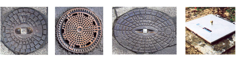 Hydrant (Unterflurhydrant) (3. von links) auf Straßen oder Gehwegen. Nicht zustellen oder darüber parken! Auf die Lage der Hydranten verweist das rot umrandete weiße Schild.